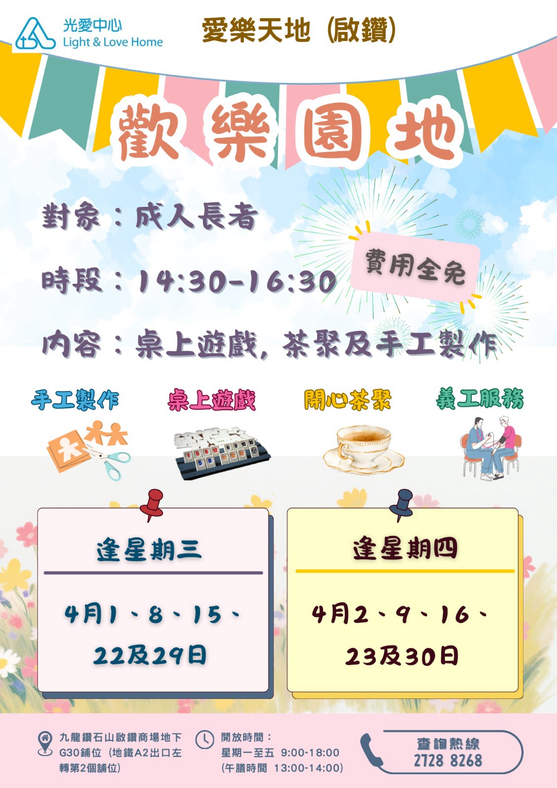 我哋中心仲有好多唔同類型嘅興趣班、活動,家庭👨👩👧👦、兒童 🧸、學生🧑🎓、成人👩🧑、長者👵👴,應有盡有!😁