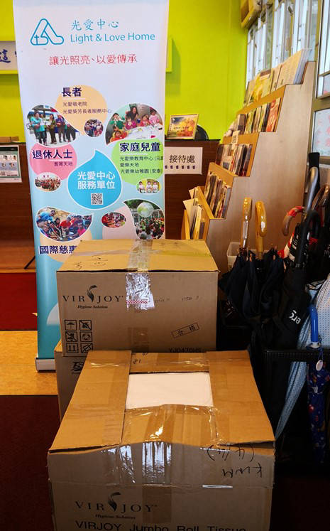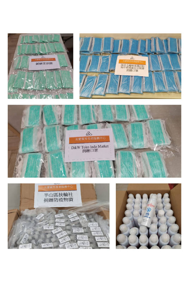 2019冠狀病毒病疫情自2020年初肆虐香港至今,仍見人間有情。光愛中心不斷收到合作團體,甚至個別社區人士捐贈物資,如口罩、福袋、酒精搓手液等。收到的物資經中心統籌後,會分發給中心屬下服務單位的會員及員工,或經義工團隊派送到社區有需要的長者或低收入家庭等。